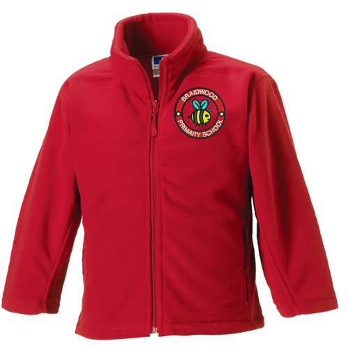 Russell Kids Fleece. A hard wearing red school fleece with your school logo embroidered on the left chest.
